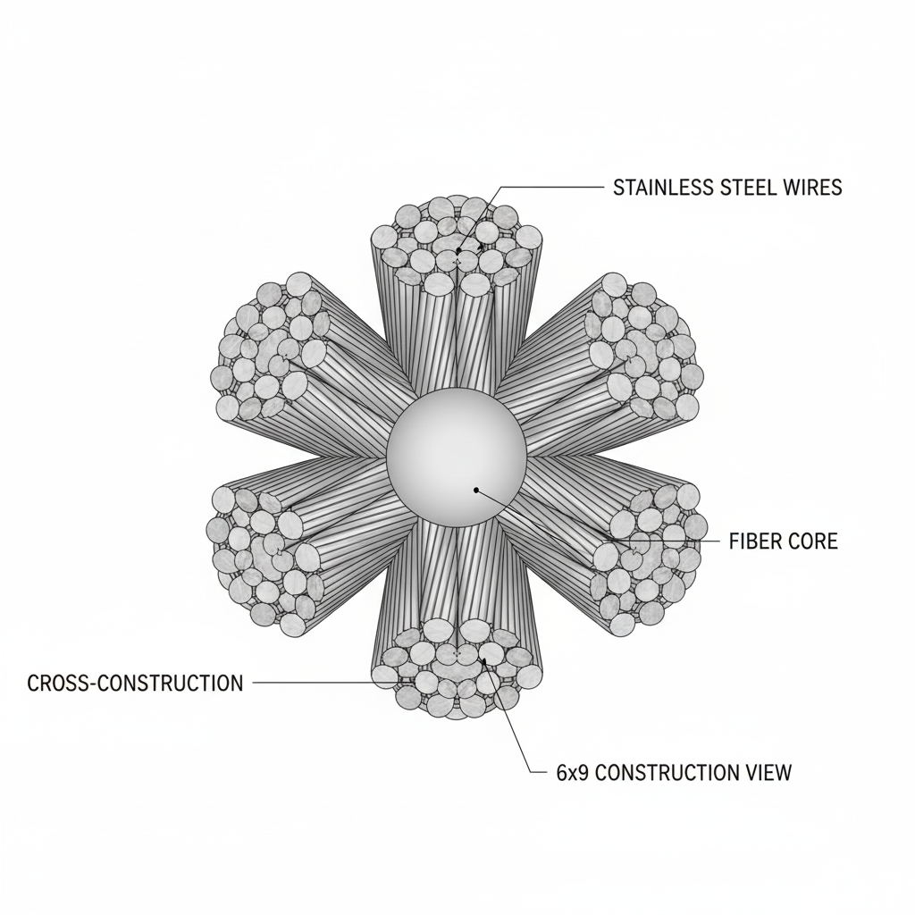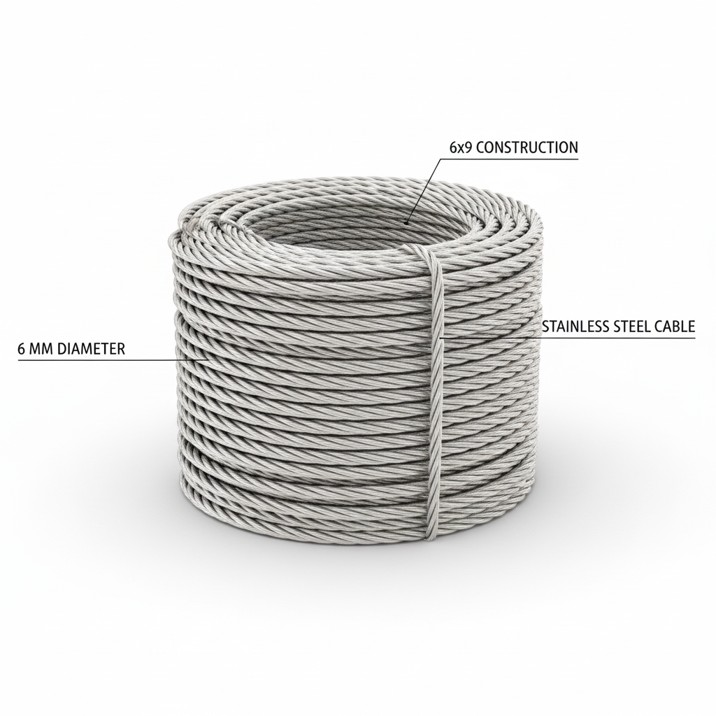El Cable de Acero Inoxidable 6×9 con Alma de Fibra es un componente esencial en la instalación de toldos vela, garantizando la correcta tensión y firmeza de la tela. Su construcción 6×9 está formada por 6 grupos de 9 filamentos de acero inoxidable trenzados alrededor de un núcleo de fibra, lo que proporciona un equilibrio ideal entre resistencia, flexibilidad y durabilidad.